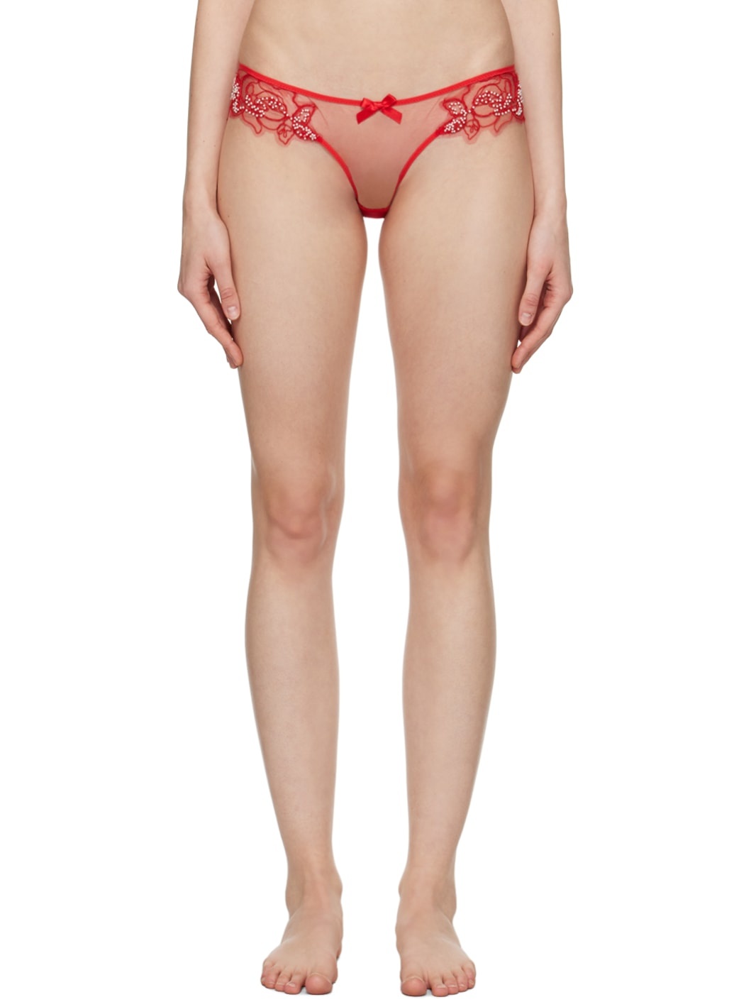 Sheer nylon tulle briefs. Embroidered floral pattern and hand-beaded detailing throughout. · Low-rise · Bow applique at elasticized waistband · Partial cotton jersey lining Supplier color: Red/Red Body: 100% polyamide. Trim: 42% viscose, 34% polyester, 24% cotton. Lining: 100% cotton. Made in Morocco 241281F074004