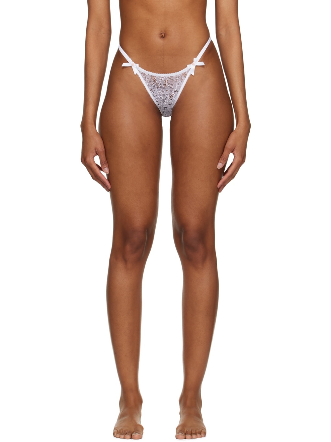Sheer nylon-blend leavers lace and polyester mesh thong. French seams and scalloped edges throughout. · Twin bow appliques at waistband · Partial cotton jersey lining Supplier color: White Body 1: 64% polyamide, 36% viscose. Body 2: 100% polyester. Lining: 100% cotton. Made in Morocco 231281F081017