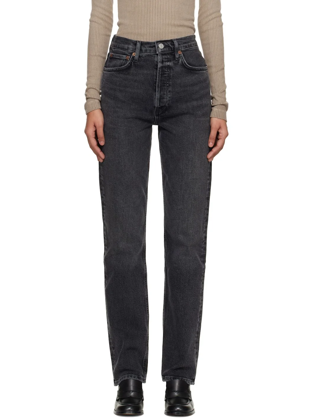 Stretch regenerative cotton denim jeans. · Fading, whiskering, and subtle distressing throughout · Straight-leg · High-rise · Belt loops · Five-pocket styling · Button fly · Logo-engraved bronze-tone hardware Supplier color: Radius 99% regenerative cotton, 1% elastane. Made in Turkey 261214F069054