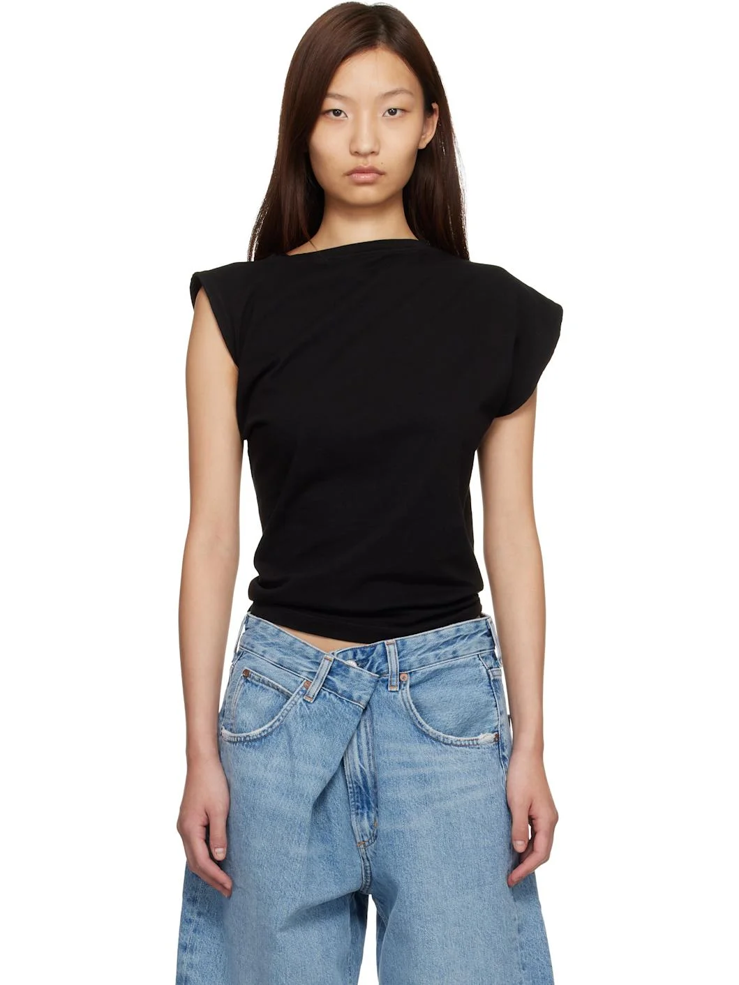Organic cotton jersey T-shirt. · Draping throughout · Asymmetrical construction · Boatneck · Cap sleeve Supplier color: Black 100% organic cotton. Made in United States 261214F110014