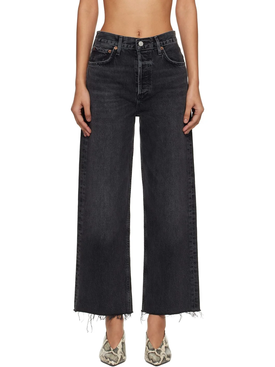 Non-stretch regenerative cotton denim jeans. · Fading, whiskering, and subtle distressing throughout · Wide-leg · High-rise · Belt loops · Five-pocket styling · Button fly · Cropped leg · Frayed edge at cuffs · Logo-engraved silver- and bronze-tone hardware Supplier color: Arcane 100% regenerative cotton. Made in Turkey 261214F069092
