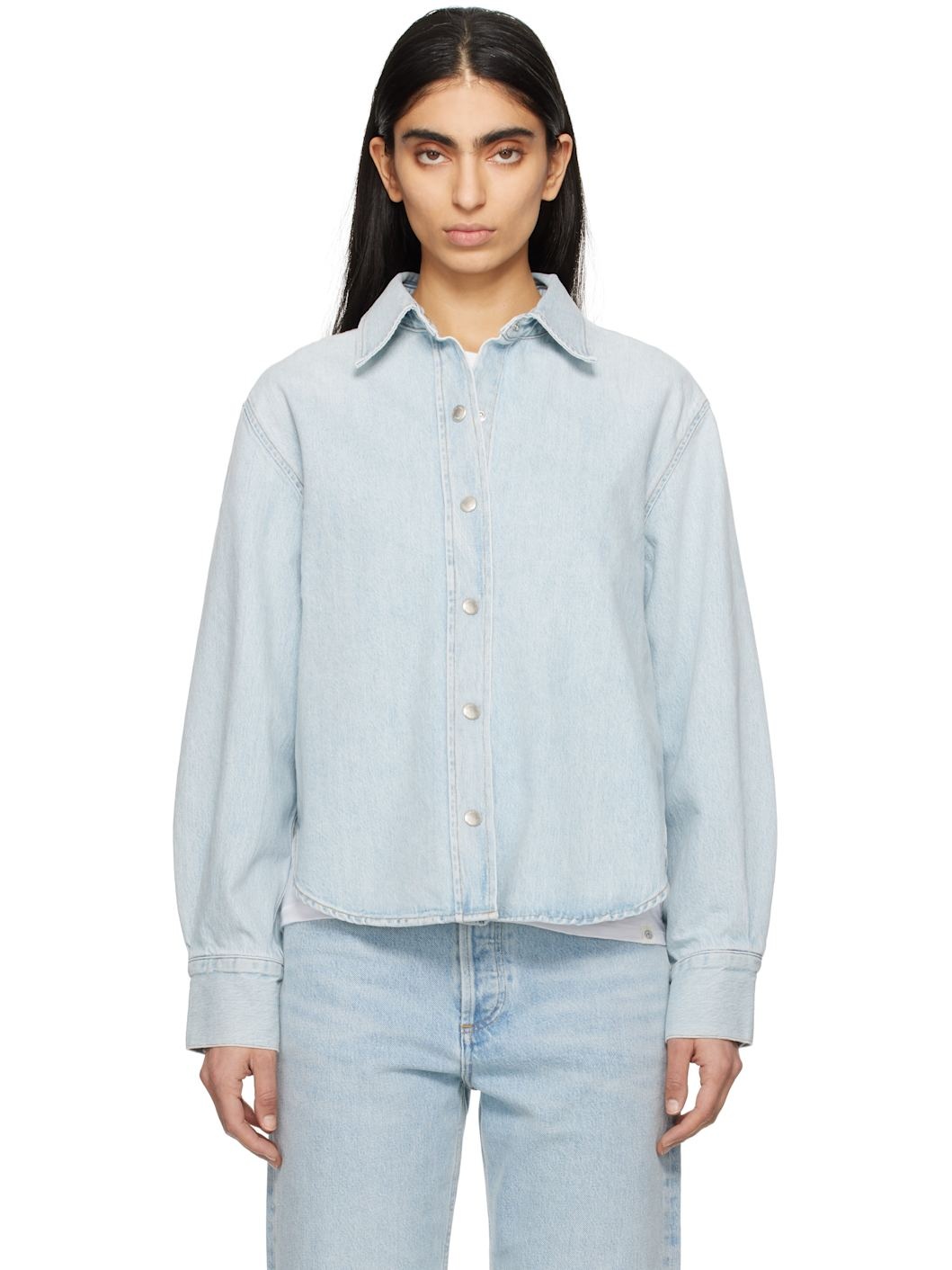 Non-stretch regenerative cotton denim shirt. Fading throughout. · Spread collar · Press-stud closure · Shirttail hem · Dropped shoulders · Single-press-stud barrel cuffs · Twin box pleats at back yoke · Logo-engraved silver-tone hardware · Contrast stitching in tan Supplier color: Cluster 100% regenerative cotton. Made in United States 251214F109004