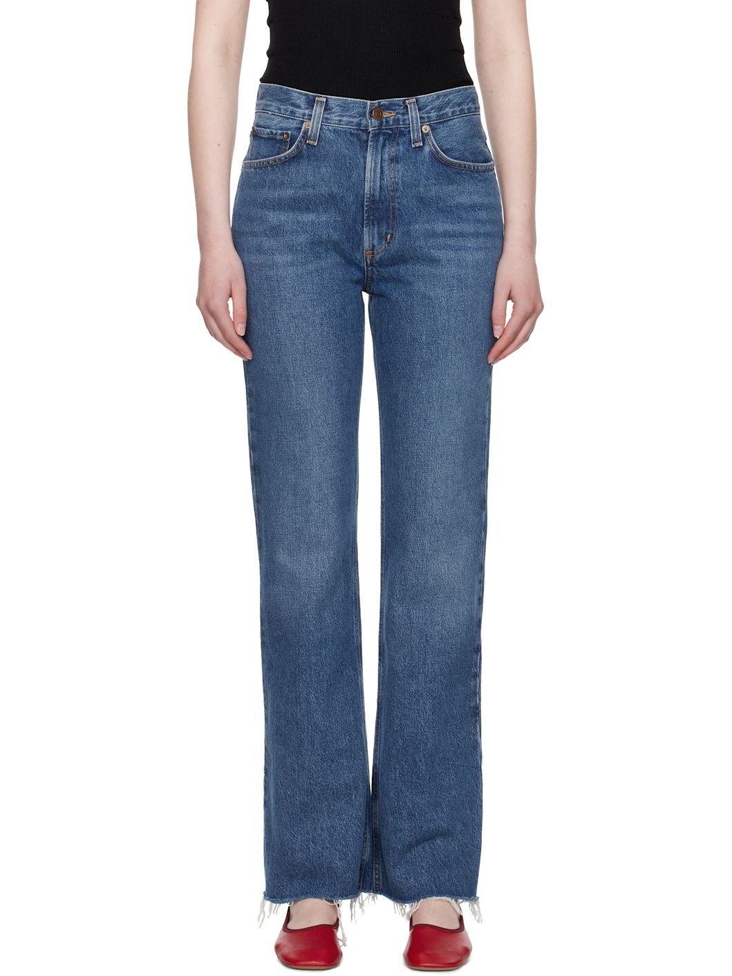 Non-stretch regenerative cotton-blend denim jeans. Fading and whiskering throughout. · Flared · High-rise · Belt loops · Five-pocket styling · Zip fly · Frayed edge at hem · Logo-engraved silver-tone hardware Supplier color: Placebo 67% regenerative cotton, 22% lyocell, 11% post consumer recycled cotton. Made in Turkey 252214F069094