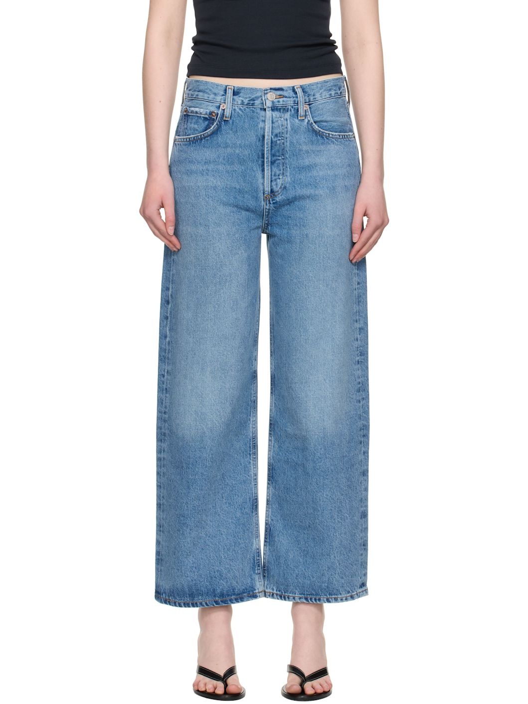 Non-stretch regenerative cotton denim jeans. Fading, whiskering, and subtle distressing throughout. · Wide-leg · High-rise · Belt loops · Five-pocket styling · Button fly · Cropped leg · Logo-engraved silver- and bronze-tone hardware · Contrast stitching in tan Supplier color: Shrine 100% regenerative cotton. Made in Turkey 252214F069036