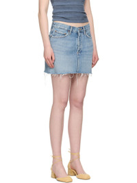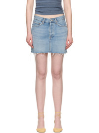 Non-stretch regenerative cotton denim miniskirt. Fading, whiskering, and subtle distressing throughout. · The Integrity Grown™-certified · Belt loops · Five-pocket styling · Button fly · Raw edge at hem · Logo-engraved silver- and bronze-tone hardware · Contrast stitching in tan Supplier color: Force 100% regenerative cotton. Made in Turkey 251214F090000