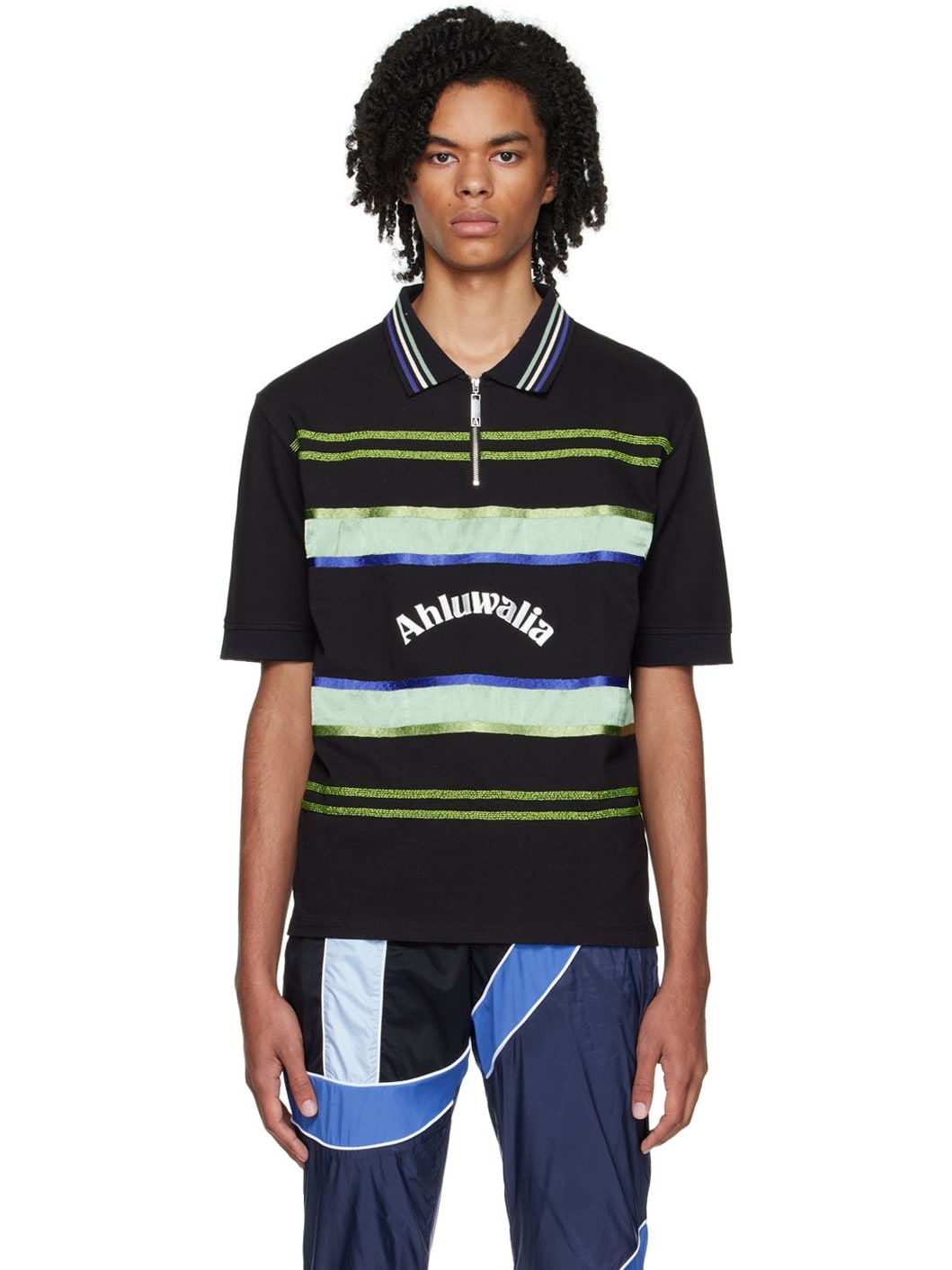Organic cotton pique polo. · Spread collar · Half-zip closure · Beaded detailing and satin trim at front · Vented side seams Supplier color: Black 100% organic cotton. Made in India 222291M212016