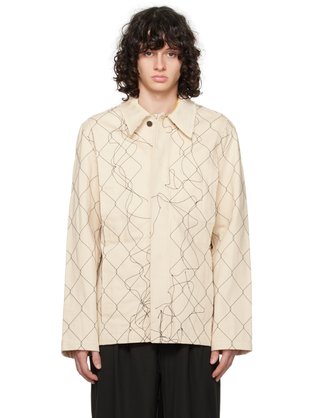 Handcrafted non-stretch organic cotton denim jacket. Embroidered graphic pattern, loose thread detailing, and raw edges throughout. · Paneled construction · Spread collar · Concealed button closure · Seam pockets · Hand-stitched logo at back collar Supplier color: Natural 2 100% organic cotton. Made in Italy 232460M177002