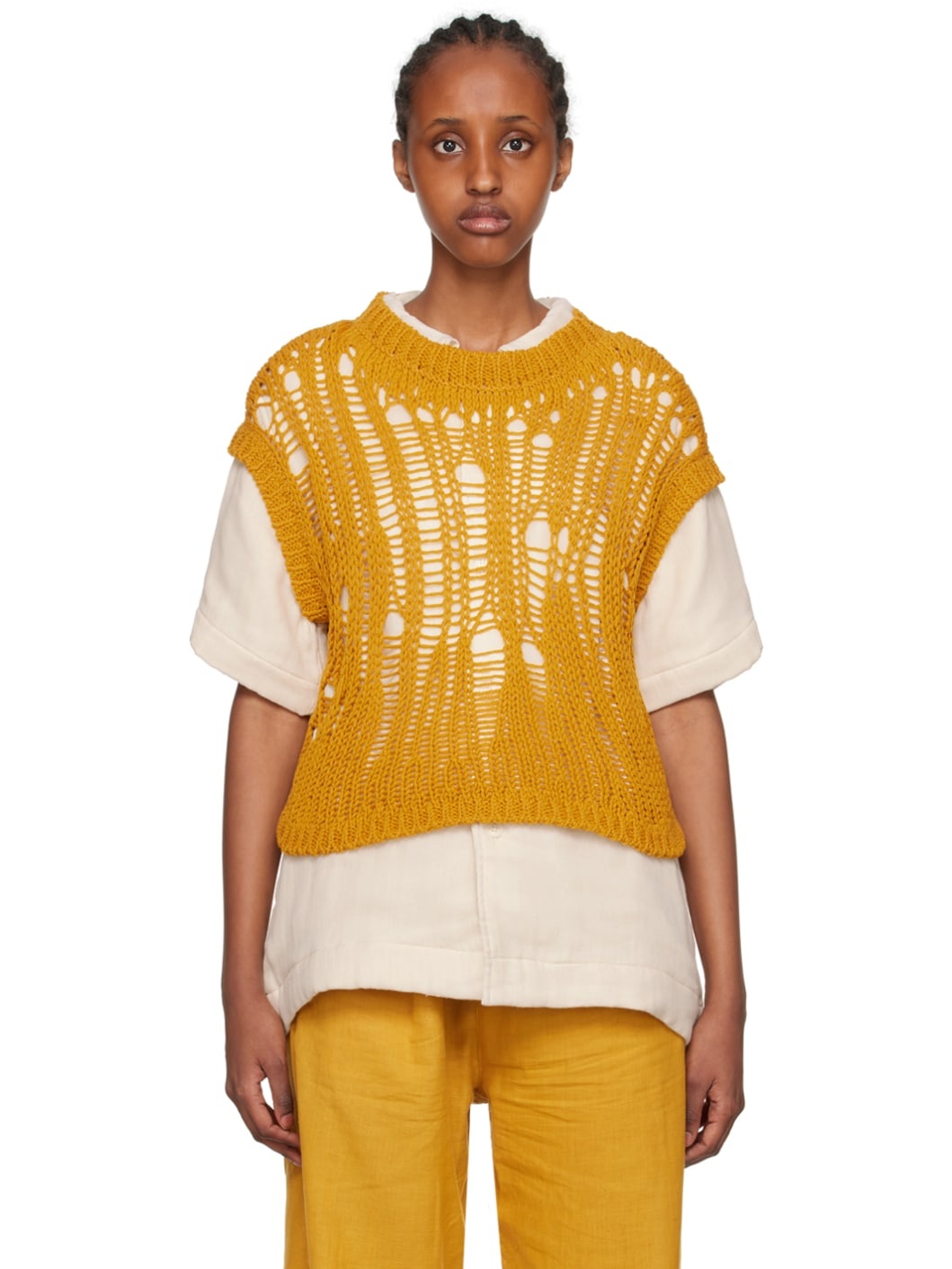Open knit recycled cashmere- and wool-blend vest. · Laddering throughout · Rib knit crewneck, hem, and armscyes Supplier color: Saffron 50% recycled cashmere, 50% wool. Made in United States 231460F096003
