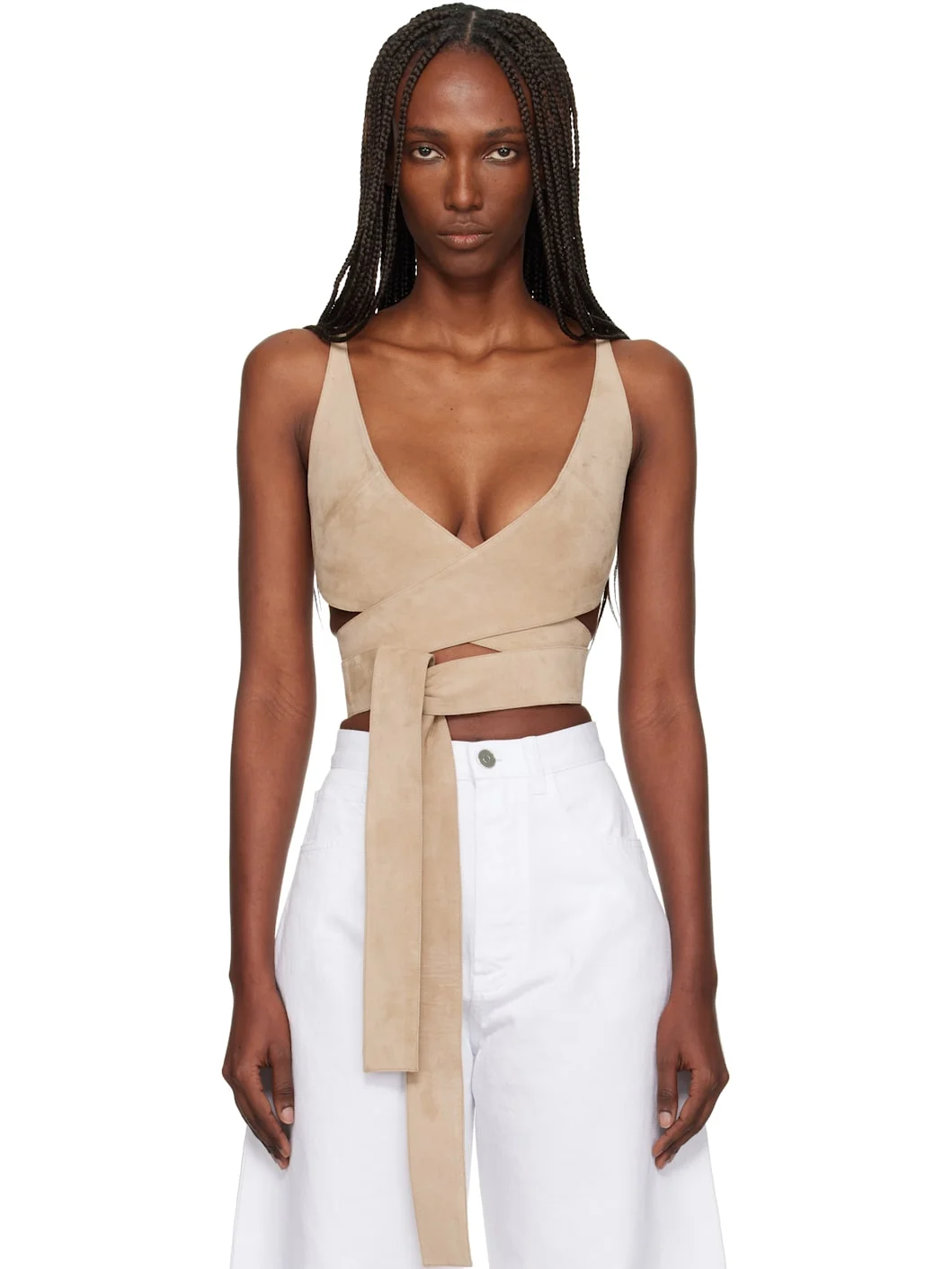 Goatskin suede top. · Wrap construction · Cutouts throughout · Plunging V-neck · Self-tie fastening at cropped hem · Fixed shoulder straps Supplier color: Beige 100% goatskin. Made in France 252483F111007