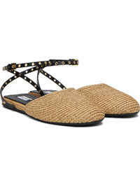 Woven paper straw ballerina flats in beige. · Wraparound calfskin pin-buckle ankle strap · Grommets at strap · Logo patch at padded lambskin footbed · Treaded rubber sole · Gold-tone hardware Supplier color: Natural Upper: paper, calfskin. Sole: rubber. Made in Italy 252483F121002