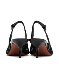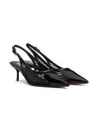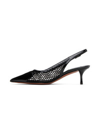 Nylon mesh and patent calfskin heels in black. · Pointed toe · Adjustable pin-buckle slingback strap · Logo patch at padded lambskin footbed · Covered kitten heel with rubber injection · Leather sole with rubber injection · Heel: H2.25" Supplier color: Noir Upper: textile, calfskin. Sole: calfskin, rubber. Made in Italy 241483F122017