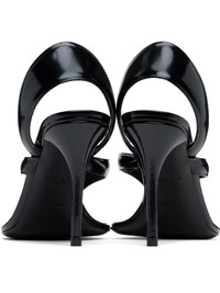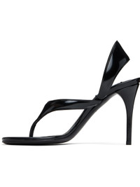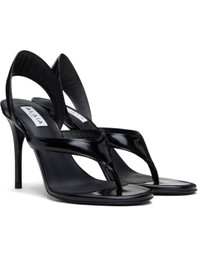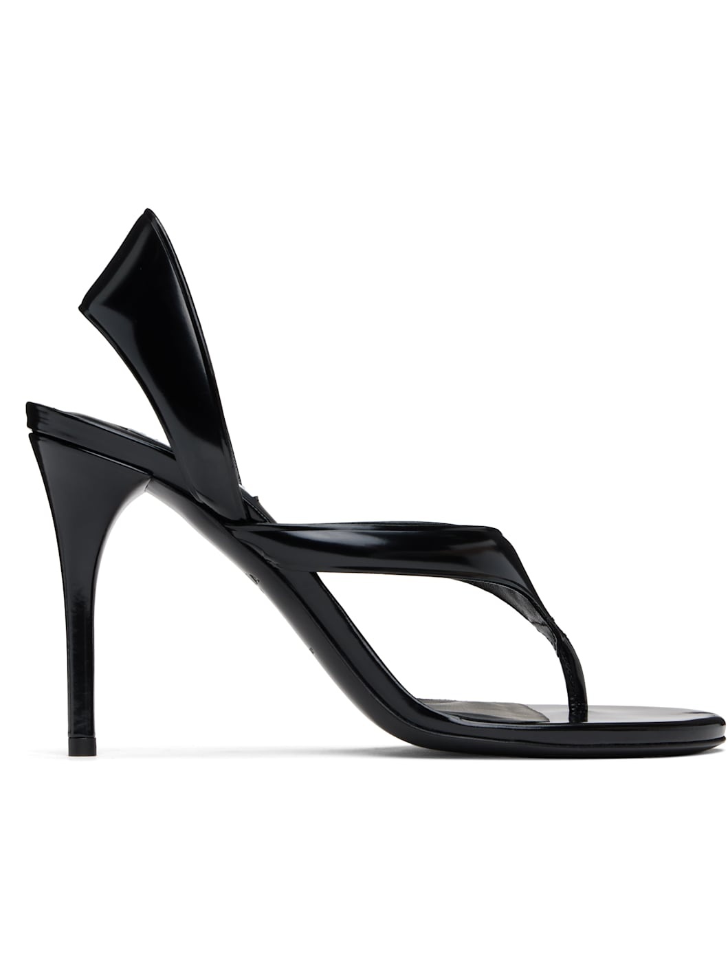 Patent calfskin heeled sandals in black. · Open toe · Thong-style strap at vamp · Slingback strap · Logo patch at padded footbed · Buffed lambskin lining · Lacquered stiletto heel with rubber injection · Calfskin sole with rubber injection · Heel: H3.5" Supplier color: Black Upper: calfskin. Sole: calfskin, rubber. Made in Italy 251483F125009
