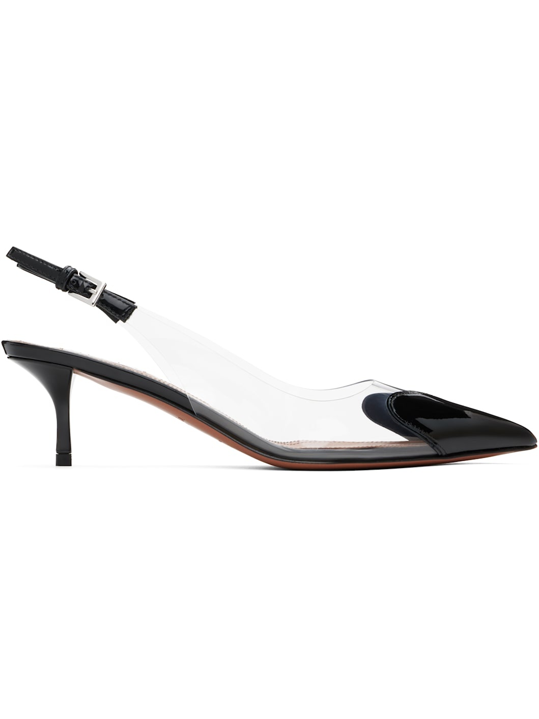 Transparent vinyl and patent lambskin heels in black. · Pointed toe · Pin-buckle slingback strap · Logo patch at padded footbed · Covered kitten heel with rubber injection · Calfskin sole with rubber injection · Heel: H2.25" Supplier color: Black Upper: lambskin, polyurethane. Sole: calfskin, rubber. Made in Italy 251483F122011