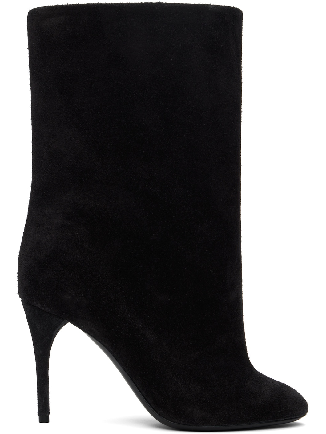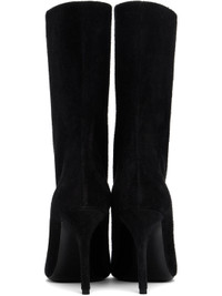 Mid-calf calfskin suede boots in black. · Pointed toe · Buffed leather lining · Covered stiletto heel with rubber injection · Calfskin sole with rubber injection · Heel: H3.5" Supplier color: Black Calfskin. Made in Italy 251483F114001