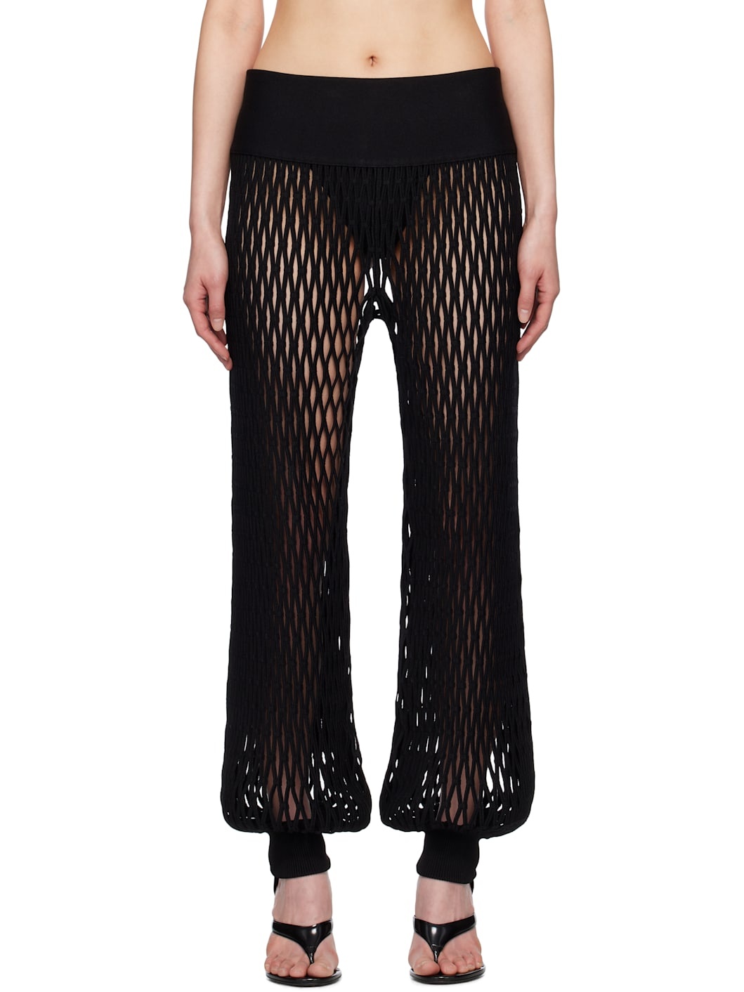 Wide-leg open-knit stretch viscose-blend trousers. · Low-rise · Rib-knit elasticized waistband and cuffs Supplier color: Black Body: 65% viscose, 25% polyester, 6% linen, 3% polyamide, 1% elastane. Trim: 72% viscose, 24% polyester, 4% polyamide. Made in Italy 251483F087004