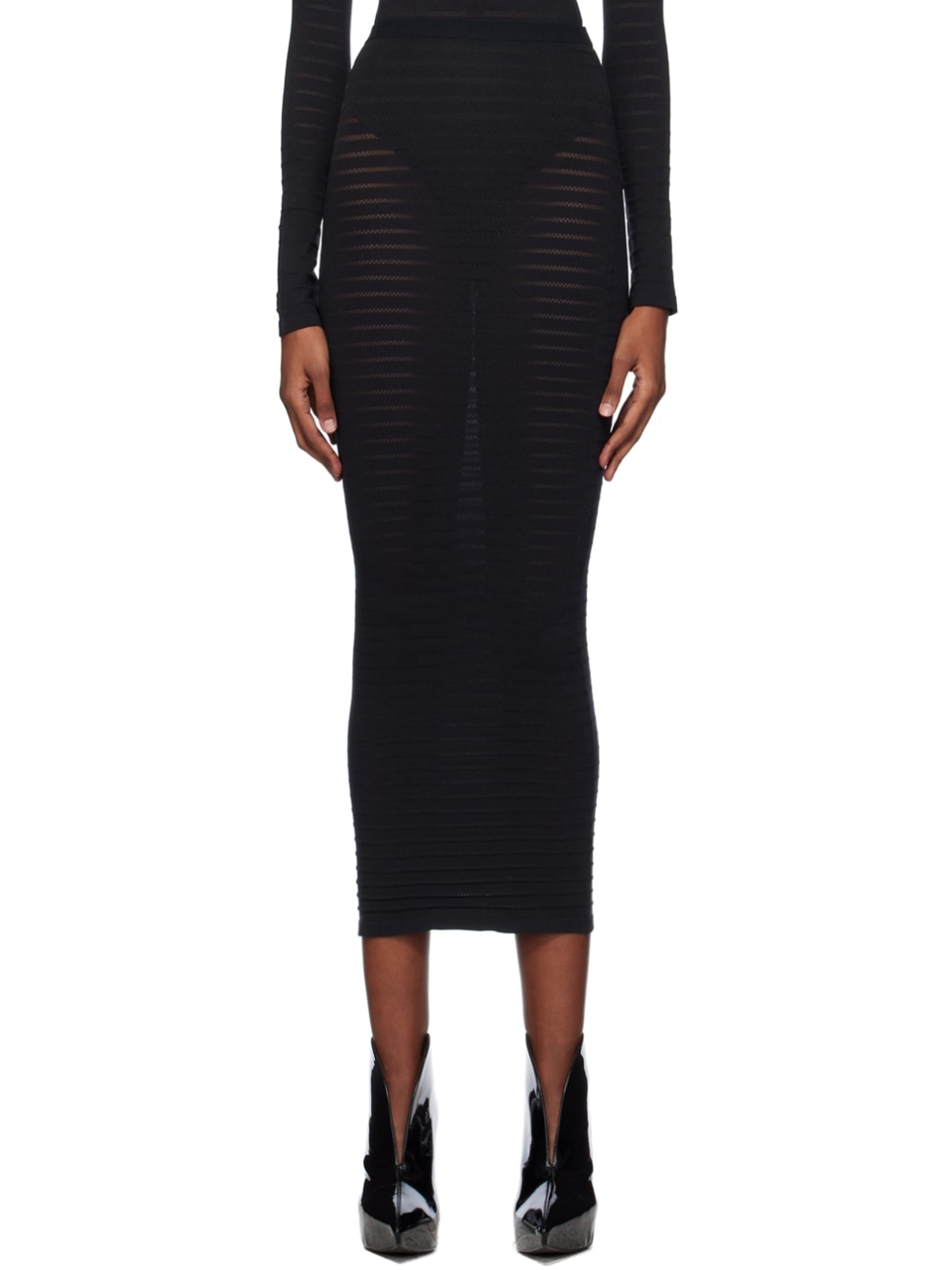 Semi-sheer nylon-blend jersey skirt. · Pointelle striped detailing throughout · Elasticized rib knit waistband Supplier color: Noir alaia 75% nylon, 25% polyester. Made in Italy 241483F092008