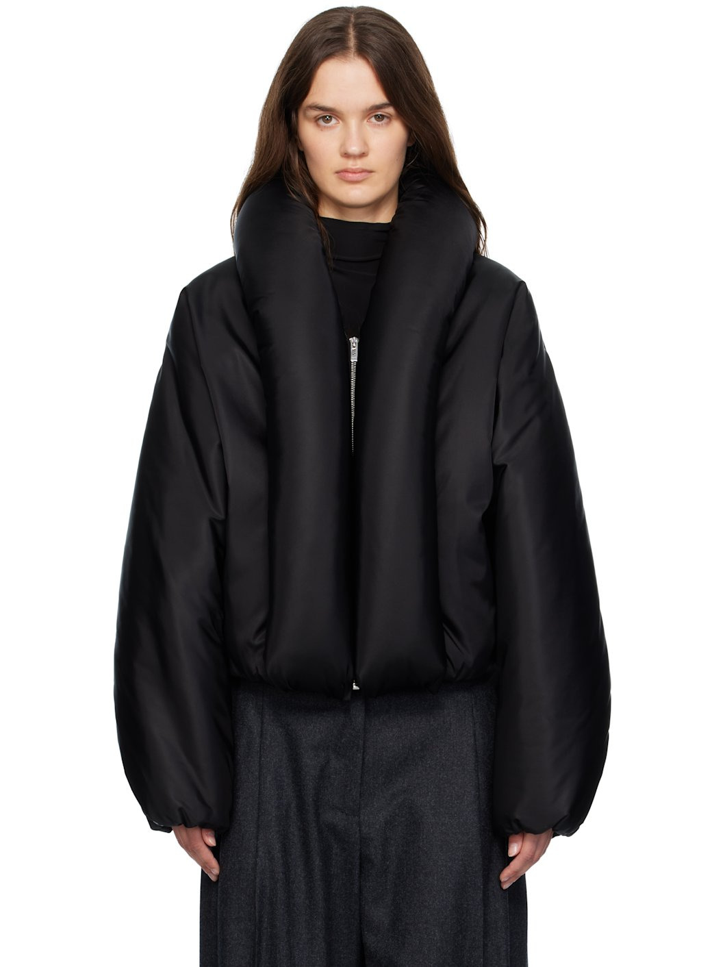 Insulated stretch nylon taffeta bomber jacket. · Rolled shawl collar · Zip closure · Seam pockets at waist · Elasticized hem and cuffs · Dropped shoulders · Full plain-woven lining Supplier color: Black Body: 96% polyamide, 4% polyurethane. Fill: 100% polyester. Lining: 100% polyester. Pocket lining: 100% cotton. Made in Italy 252483F061000