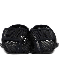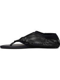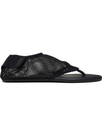 Sheer fishnet flat sandals in black. · Elasticized trim throughout · Thong-style strap at vamp · Velcro fastening with logo stamp at outer side · Logo patch at padded lambskin footbed · Treaded rubber sole Supplier color: Black Upper: textile, lambskin. Sole: rubber. Made in Italy 252483F124000