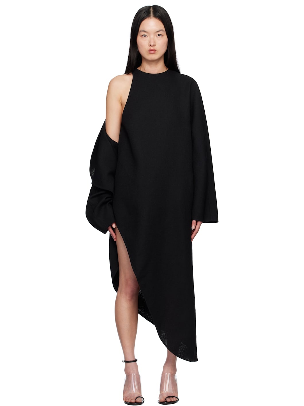 Double-faced virgin wool-blend gazar coat. Draping throughout. · Wrap construction · Ruffled shawl lapel · Concealed button closure · Asymmetric hem · Raglan sleeves · Unlined Supplier color: Noir Alaia Body: 92% virgin wool, 8% polyamide. Lining: 100% cotton. Made in Italy 251483F059000