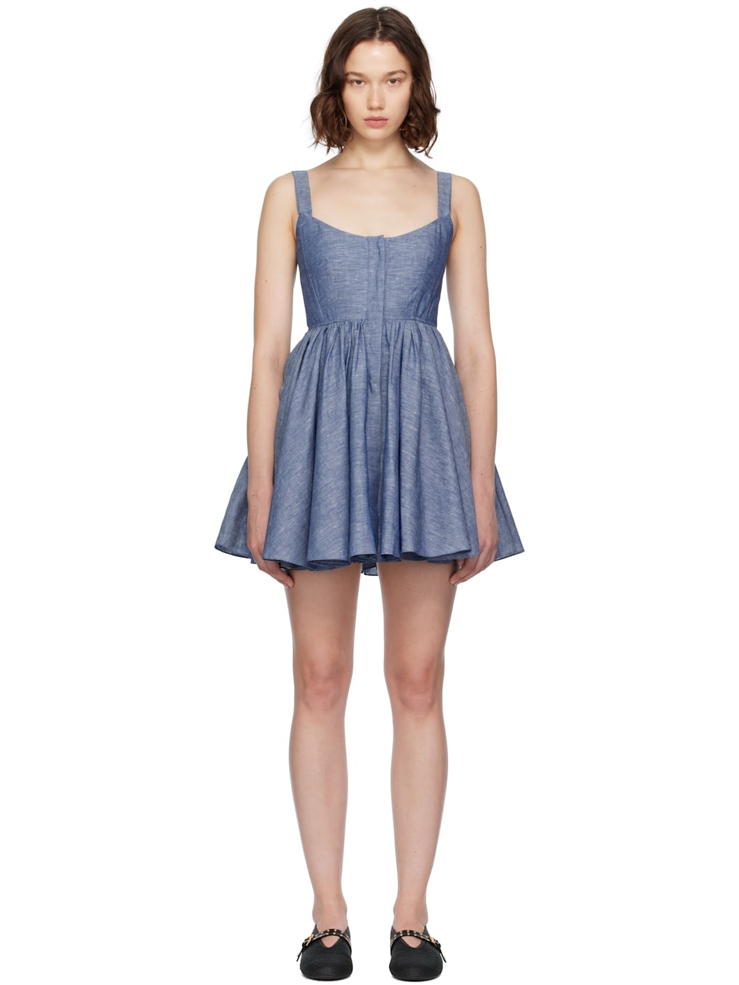 Cotton- and linen-blend chambray minidress. · Scoop neck · Concealed button closure · Boning at bodice · Gathering at waist · Seam pockets · Fully lined Supplier color: Blue jeans 55% cotton, 45% linen. Made in Italy 252483F052006
