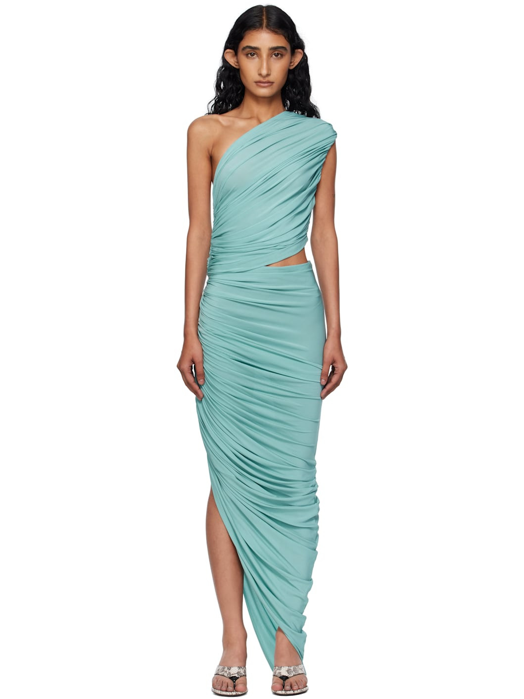Stretch viscose jersey maxi dress. · Draping and ruching throughout · Single-shoulder construction · Cutout at waist · Slit at asymmetric hem Supplier color: Blue 96% viscose, 4% elastane. Made in Italy 252483F055005