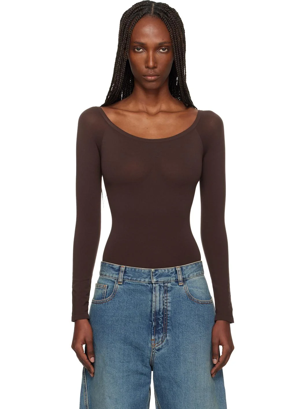 Semi-sheer stretch nylon jersey bodysuit. · Off-the-shoulder construction · Elasticized collar · Rolled edge at cuffs · Press-stud closure at bottom Supplier color: Chocolate 75% polyamide, 25% elastane. Made in Italy 252483F358001