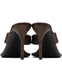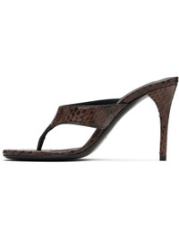 Snakeskin heeled sandals. · Open toe · Thong-style strap at vamp · Lambskin lining · Covered stiletto heels with rubber injection · Leather sole · Heel: H4" Supplier color: Brun force Upper: elaphe leather. Sole: leather. Made in Italy 252483F125003