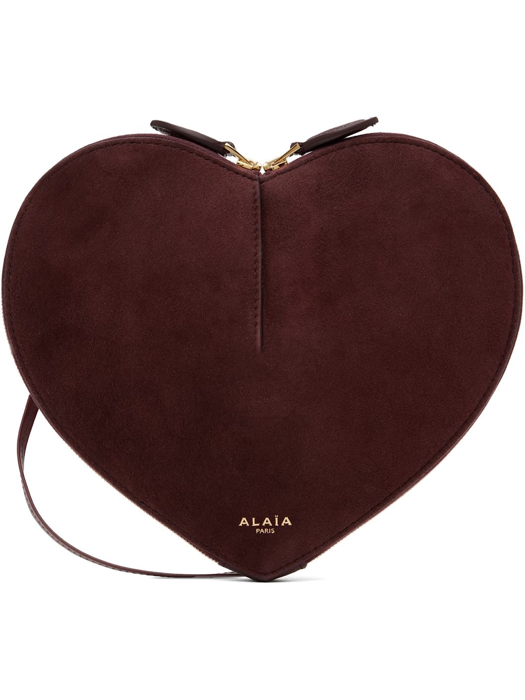 Heart-shaped rigid suede shoulder bag in burgundy. · Buffed goatskin trim throughout · Adjustable crossbody strap · Logo stamp at face · Two-way zip closure · Accordion panels at interior · Buffed calfskin lining · Silver-tone hardware · H7.5" x W8.5" x D3" Supplier color: Red Goatskin. Made in Italy 252483F048005