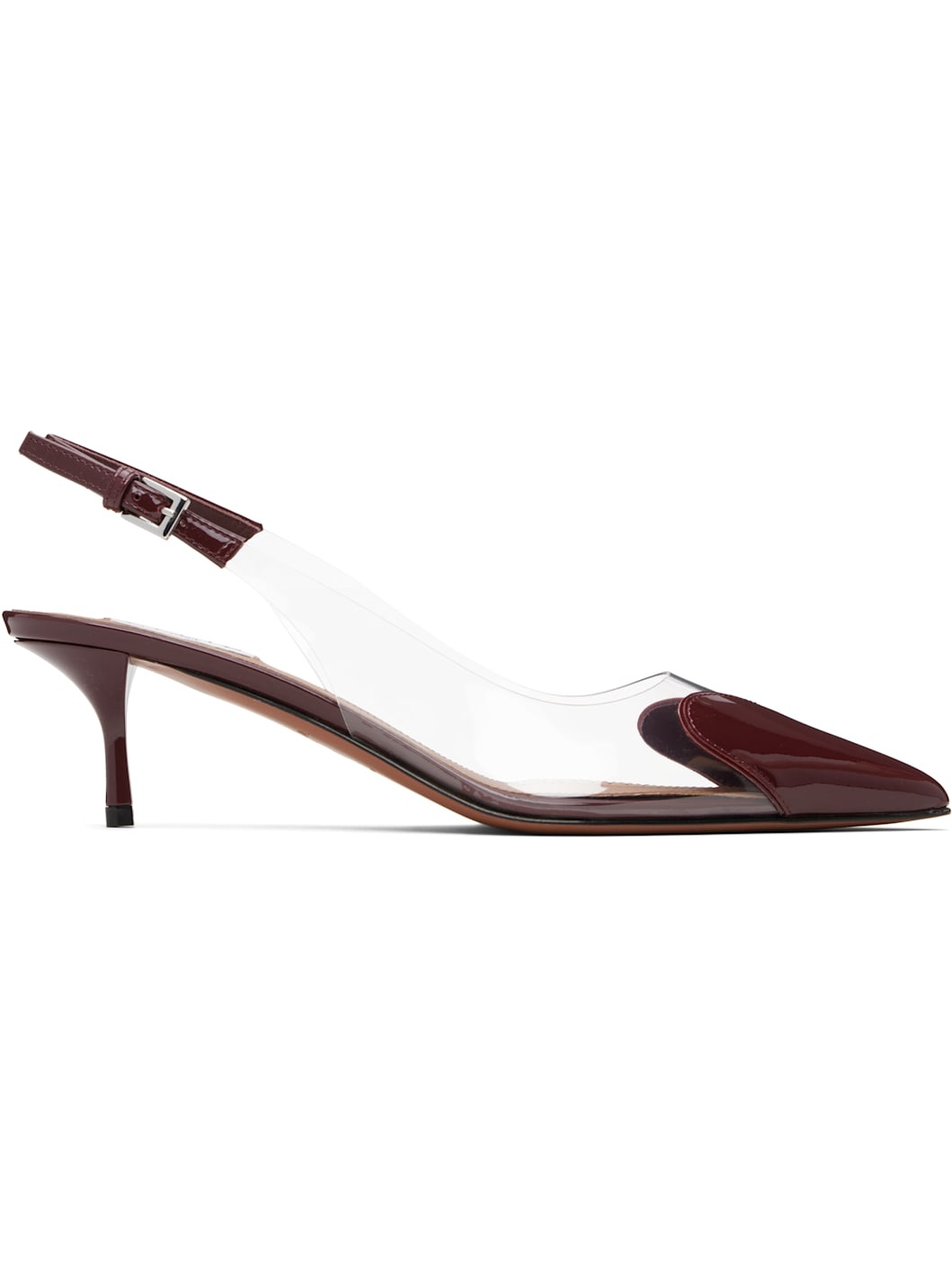Transparent vinyl and patent lambskin heels. · Pointed toe · Pin-buckle slingback strap · Logo patch at calfskin footbed · Covered kitten heel with rubber injection · Calfskin sole · Heel: H2.25" Supplier color: Rouge grenat Upper: polymer, lambskin. Sole: calfskin, rubber. Made in Italy 252483F122003