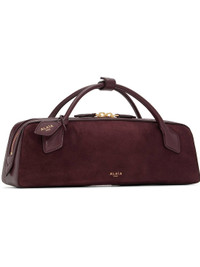 Goatskin suede top handle bag. · Grained leather trim throughout · Press-stud tab at rolled carry handles · Detachable logo tag at handle · Logo stamp at face · Two-way zip closure · Card slot with removable mirror at interior · Suede lining · Gold-tone hardware · H3.5" x W12.25" x D2.5" Supplier color: Garnet red Goatskin. Made in Italy 252483F046016