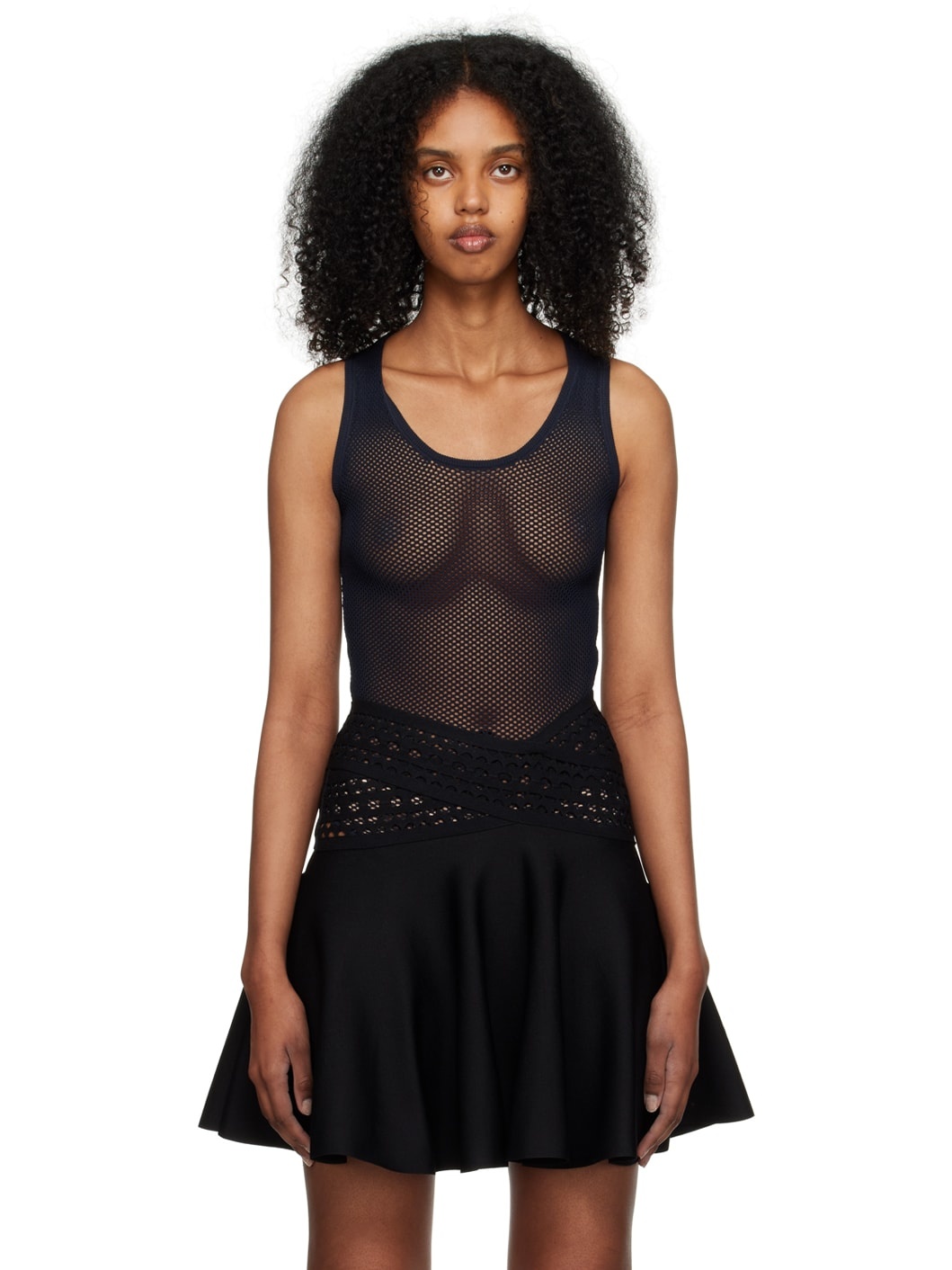 Sheer viscose-blend mesh bodysuit. Rib knit trim throughout. · Scoop neck · Press-stud fastening at bottom Supplier color: Minuit 67% viscose, 33% polyester. Made in Italy 232483F358000