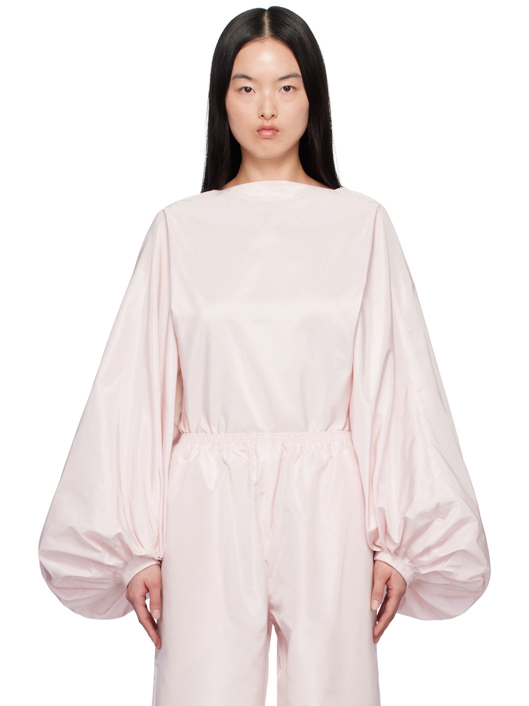 Silk taffeta bodysuit. · Boat neck · Gathering at elasticized waist · Press-stud closure at bottom · Balloon sleeves · Pleats at cuffs · Open back · Partial stretch viscose jersey lining Supplier color: Rose pale Body: 100% silk. Lining: 96% viscose, 4% elastane. Made in Italy 251483F358003