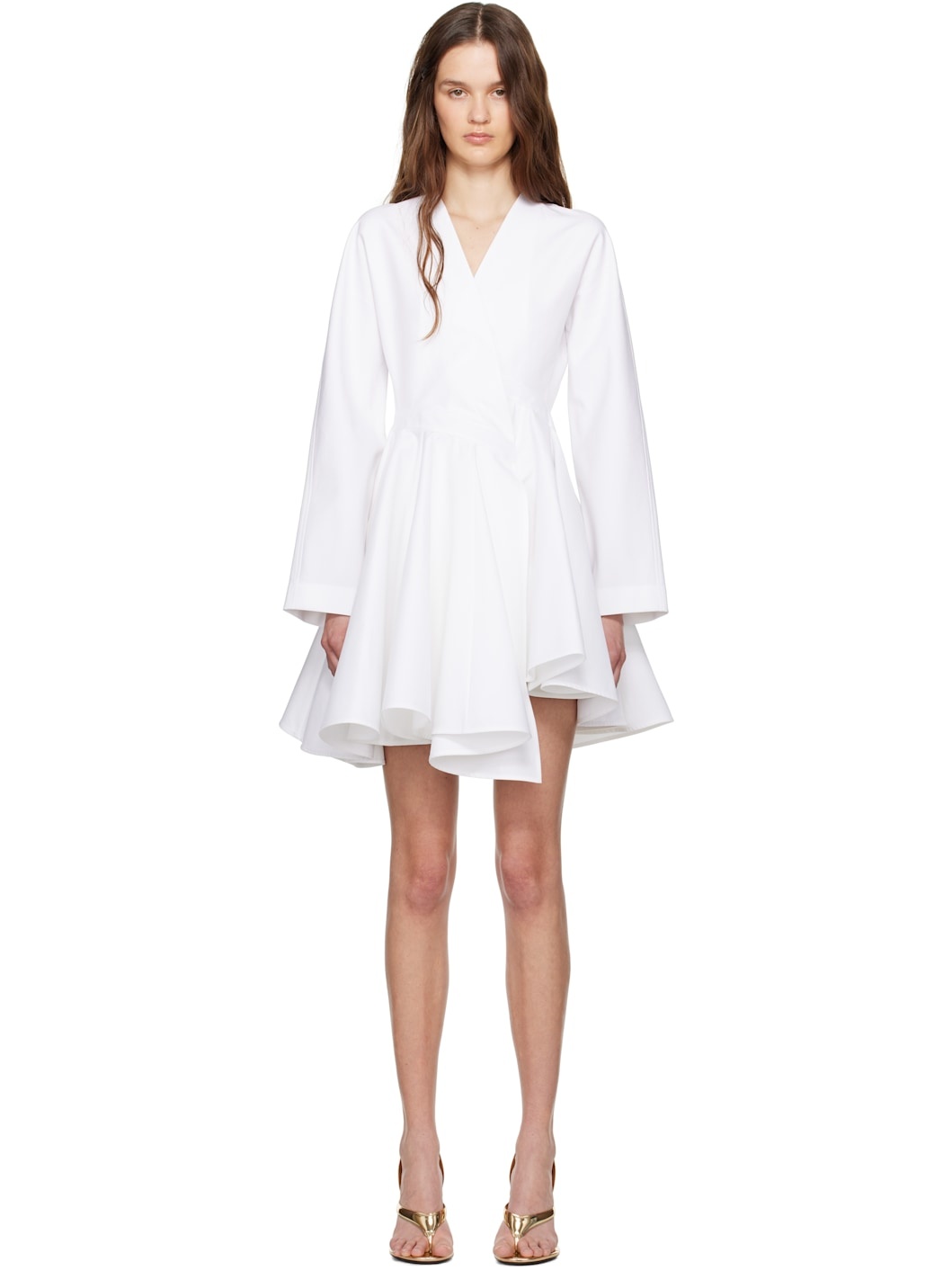 Cotton poplin minidress. · V-neck · Open front · Integrated wire belt at waist · Seam pockets · Flared asymmetrical hem Supplier color: White 100% cotton. Made in Italy 251483F052002