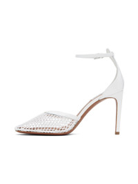 Sheer nylon fishnet and patent calfskin heels in white. · Pin-buckle ankle strap · Logo patch at grained lambskin footbed · Covered stiletto heel with rubber injection · Calfskin sole · Heel: H3.5" Supplier color: Blanc optique Upper: textile, calfskin. Sole: calfskin, rubber. Made in Italy 242483F122004