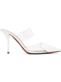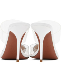 Transparent vinyl and patent calfskin mules in white. · Pointed toe · Strap at vamp · Logo patch at padded lambskin footbed · Covered stiletto heel with rubber injection · Calfskin sole with rubber injection · Heel: H3.5" Supplier color: Optic white Upper: calfskin, polyurethane. Sole: calfskin, rubber. Made in Italy 251483F122004