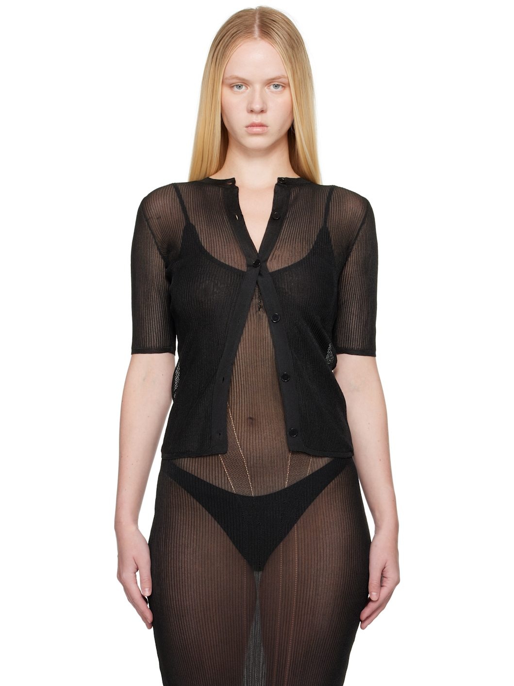 Semi-sheer rib-knit nylon-blend cardigan. · Crewneck · Button closure Supplier color: Black 70% polyamide, 30% polyester. Made in Belgium 251288F095003