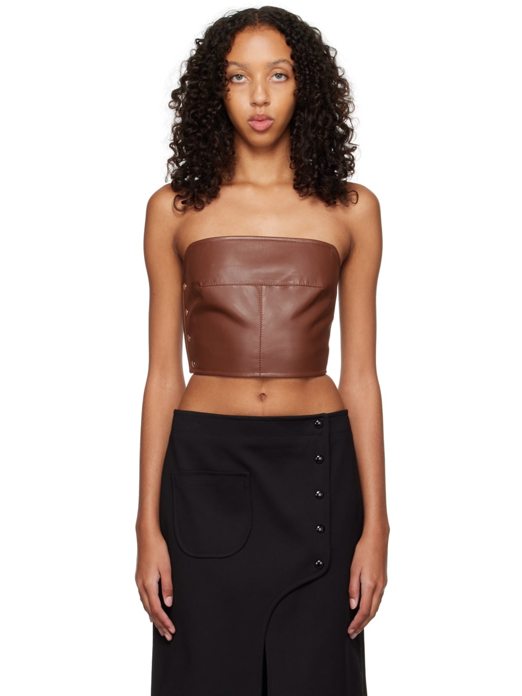 Polished faux-leather bustier-style tank top. · Straight neck · Press-stud button closure at back · Full jersey lining Supplier color: Chocolate brown Body: 50% polyester, 50% polyurethane. Lining: 100% cotton. Made in Georgia 222081F111002