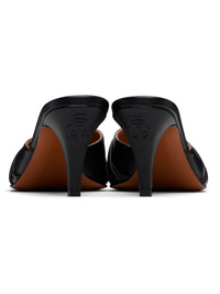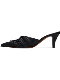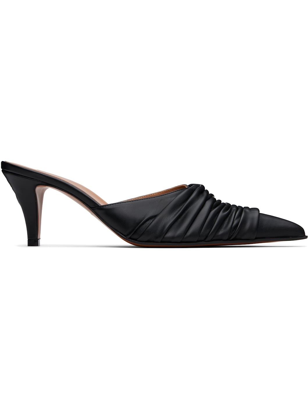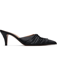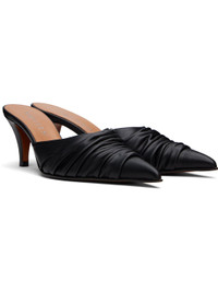Stretch faux-leather mules in black. · Pointed toe · Ruching at vamp · Logo graphic-embossed covered stiletto heel · Polished leather sole with rubber injections · Heel: H2.75" Supplier color: Black Upper: synthetic. Sole: leather, rubber. Made in Italy 251259F122001