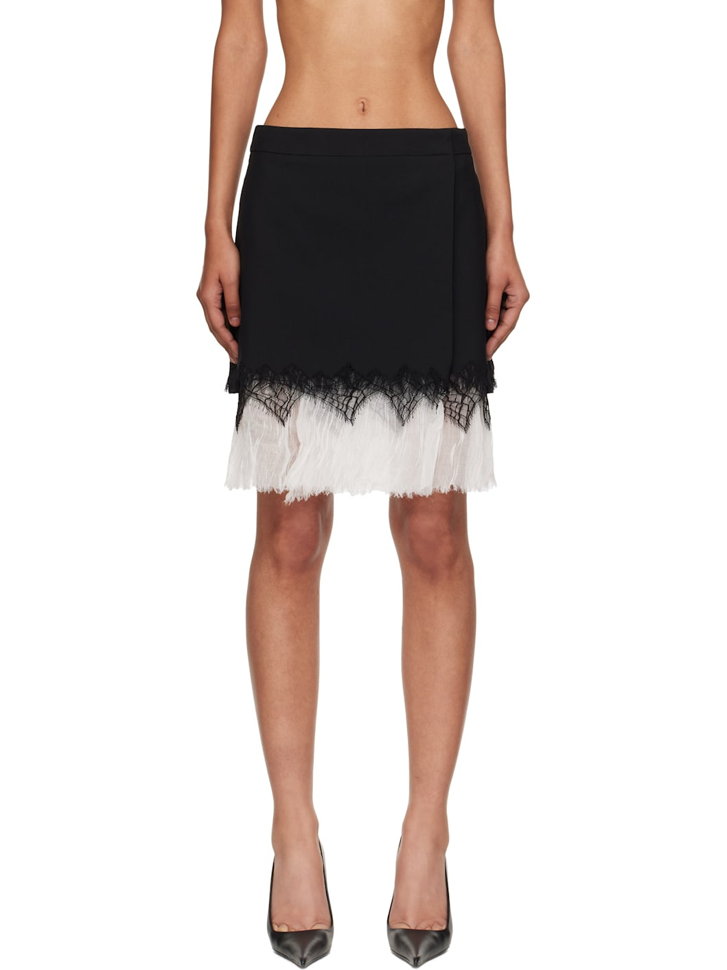 Wool gabardine miniskirt. · Wrap construction · High-rise · Lace and silk crepon trim with raw edges at hem · Full satin lining Supplier color: Black Body: 100% wool. Trim 1: 100% silk. Trim 2: 60% viscose, 40% polyamide. Lining: 100% cupro. Made in Italy 251259F090001