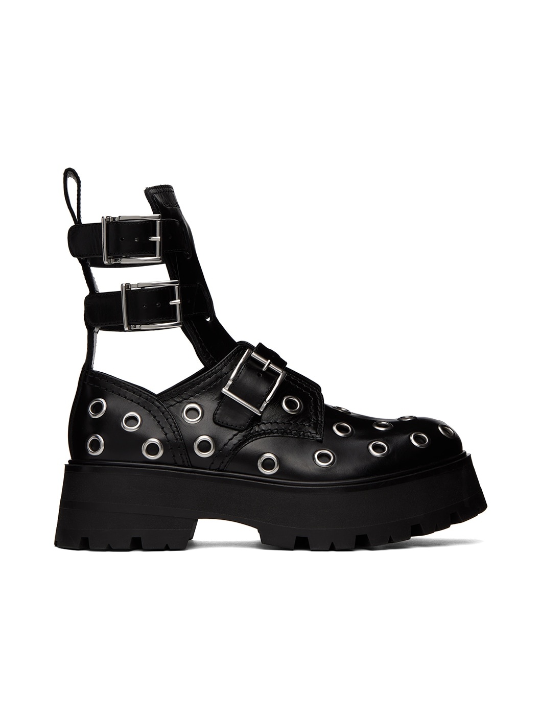 Ankle-high buffed leather boots in black. Eyelet hardware throughout. · Pin-buckle straps at vamp and collar · Logo embossed at tongue · Pull-loop at heel collar · Cutouts at sides · Foam rubber platform midsole · Treaded rubber outsole · Platform: H2 in Supplier color: Black/Silver Upper: leather. Sole: rubber. Made in Italy 231259F113005