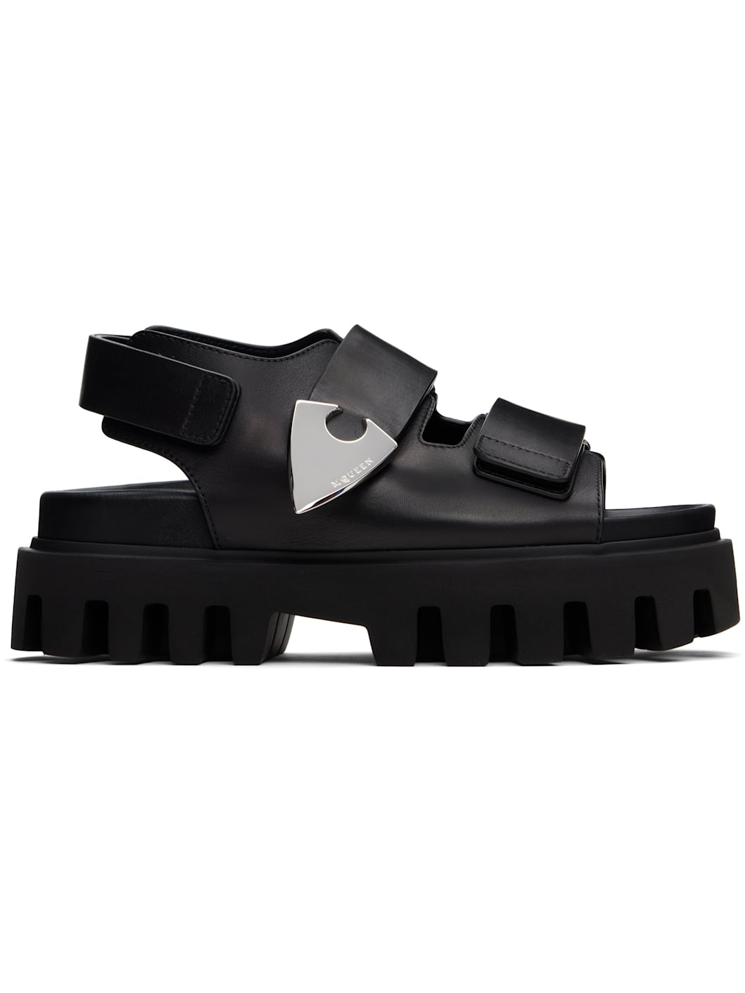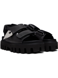 Buffed calfskin flat sandals in black. · Open toe · Velcro straps at vamp · Velcro slingback strap · Molded leather footbed · Foam rubber platform midsole · Lugged rubber sole · Logo-engraved silver-tone hardware · Platform: H1.5" Supplier color: Black/Silver Upper: calfskin. Sole: rubber. Made in Italy 251259F124000