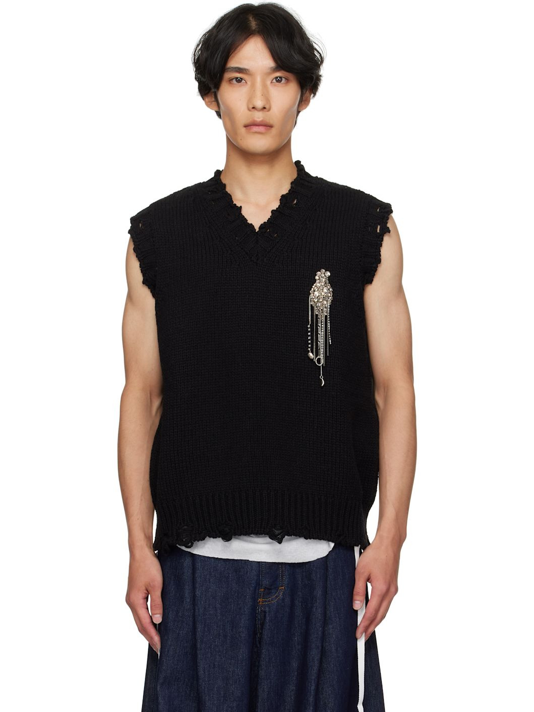 Knit wool- and cotton-blend vest. · Distressing at rib-knit V-neck, hem, and armscyes · Applique with crystals, charms, and extended chains at chest Supplier color: Black Body: 66% wool, 34% cotton. Trim 1: 66% wool, 34% cotton. Trim 2: 100% polyester. Made in Italy 251259M206000
