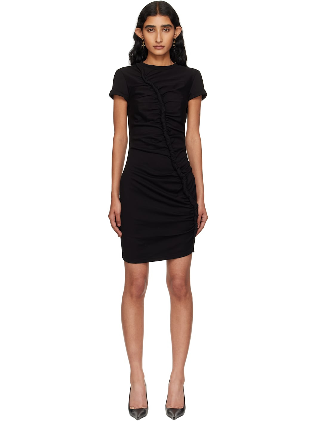 Washed cotton jersey minidress. · Rib-knit crewneck · Twisted piping and ruching at front · Concealed zip closure at side seam Supplier color: Black 100% cotton. Made in Italy 251259F052001