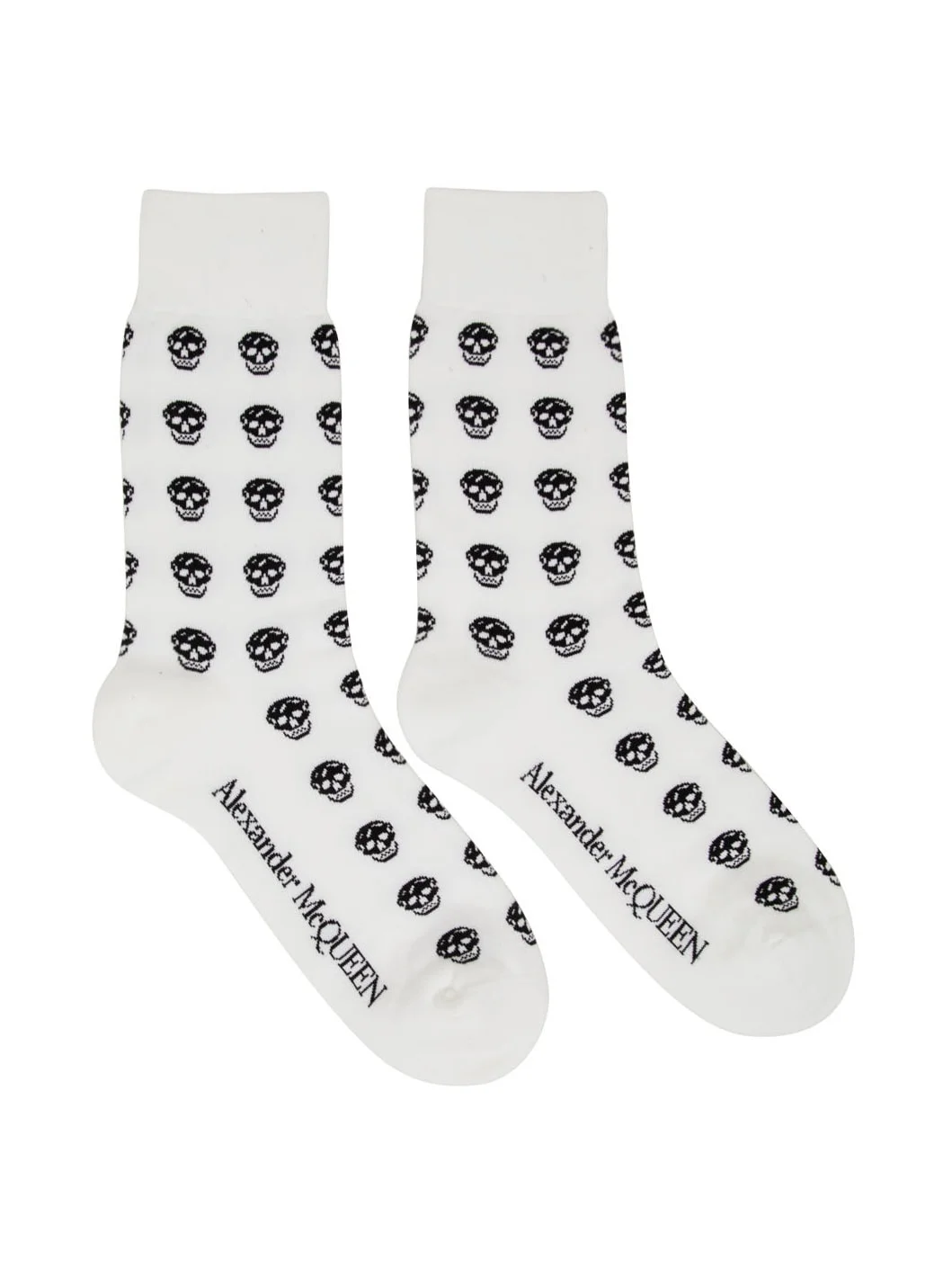 Calf-high stretch knit cotton-blend socks featuring jacquard knit signature skull pattern in white and black. · Rib knit cuffs · Jacquard knit logo in black at sole Supplier color: White/Black 77% cotton, 22% polyamide, 1% elastane.