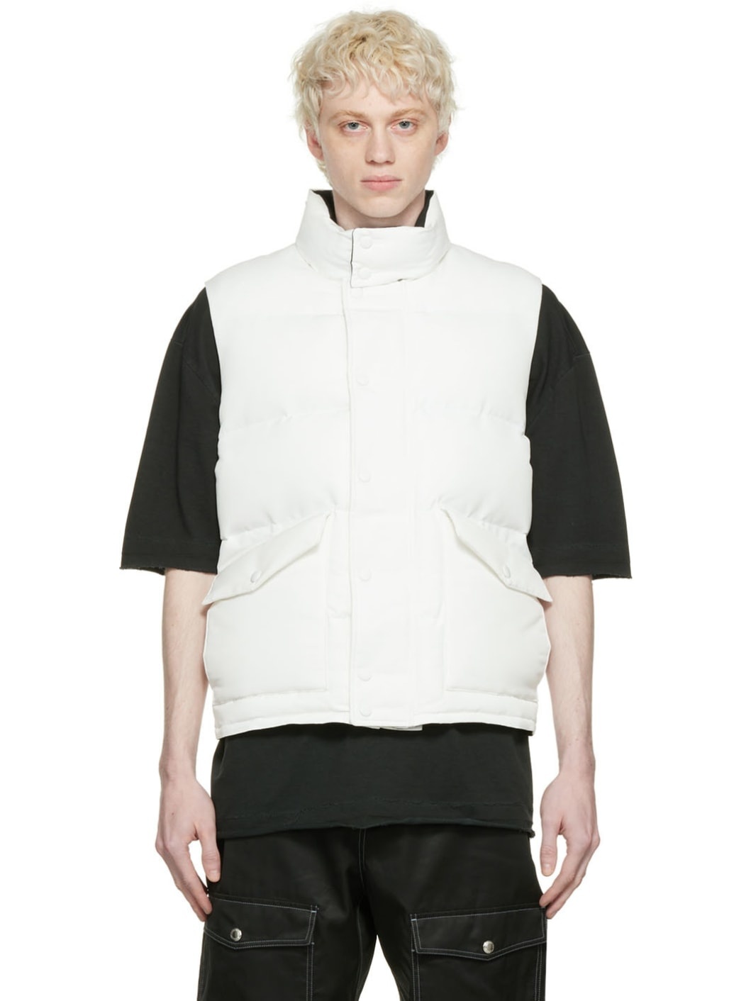 Insulated quilted polyester taffeta vest. Logo printed at back. · Stand collar · Concealed zip closure with press-stud placket · Flap pockets with press-stud fastening · Fully lined Supplier color: White/Black 100% polyester. Made in Italy 222259M185002