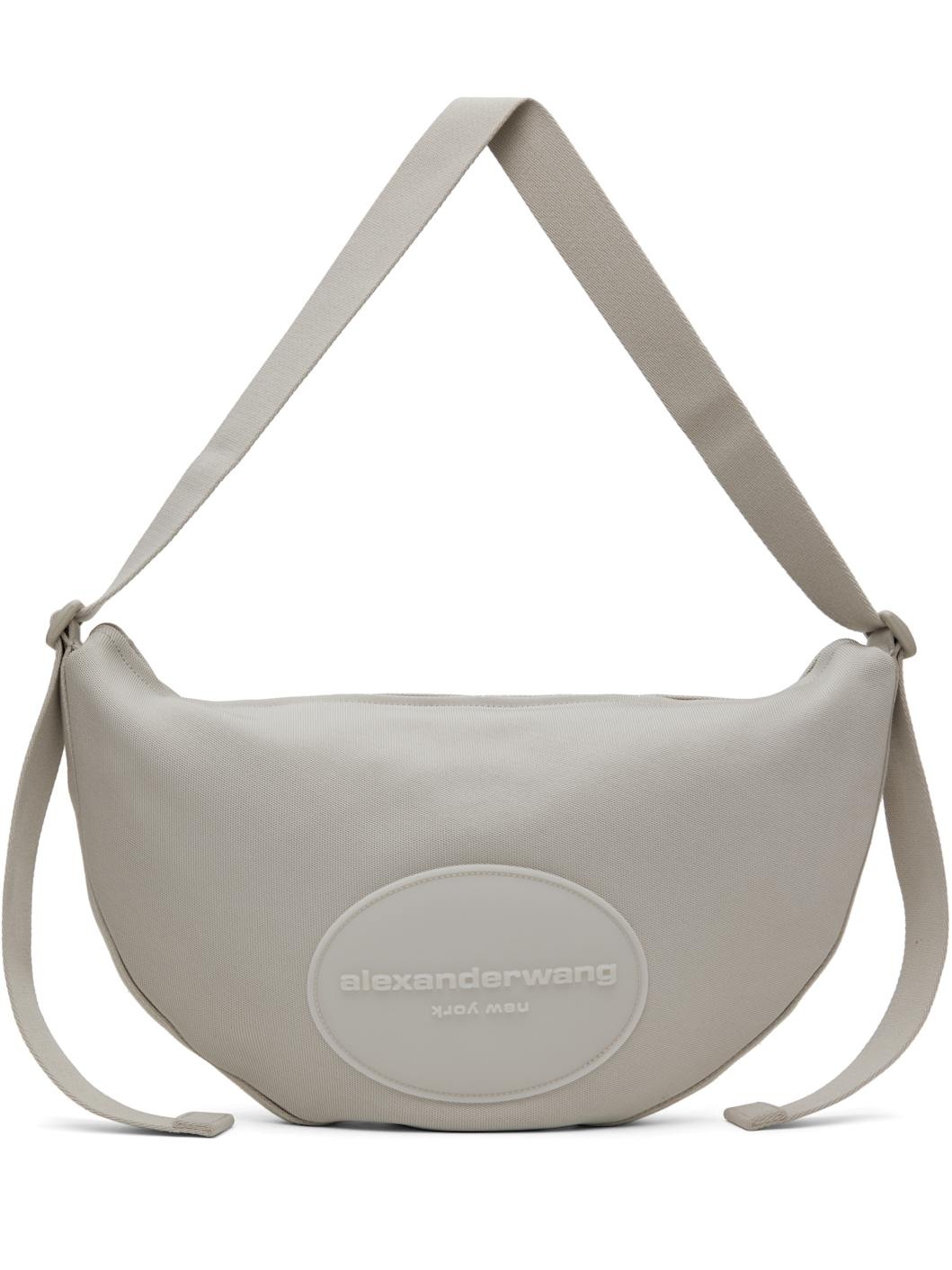 Polyurethane-coated nylon canvas shoulder bag in gray. · Adjustable crossbody strap · Rubberized logo patch at face · Zip closure · Zip pocket at interior · Twill lining · H11" x W17.5" x D2" Supplier color: Oyster Textile. Made in Viet Nam 251187F048016