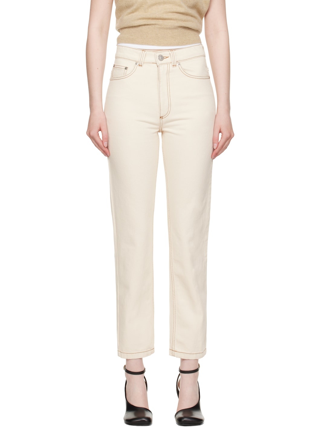 Non-stretch denim jeans. · Belt loops · Five-pocket styling · Zip fly · Logo patch at back waistband · Contrast stitching in tan Supplier color: White cream 100% cotton. Made in Portugal 251482F069006