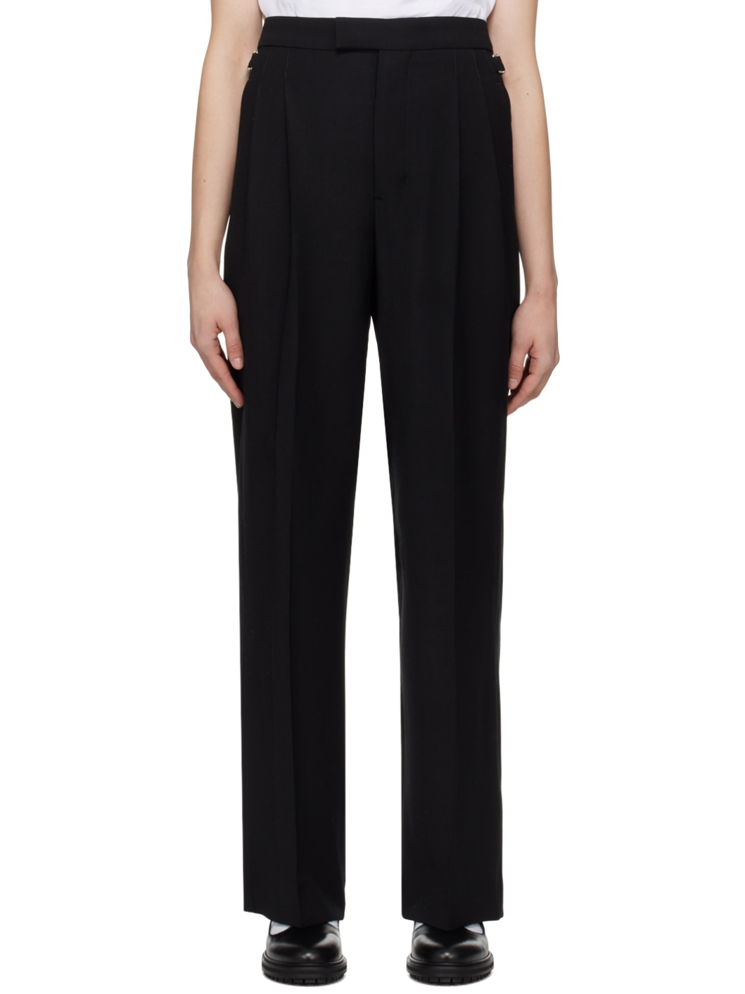 Wide-fit viscose- and virgin wool-blend twill trousers. · Adjustable cinch straps · Four-pocket styling · Button-fly · Knife pleats at front · Central crease at legs · Darts at back · Partial satin lining Supplier color: Black Body: 55% viscose, 45% virgin wool. Lining 1: 100% polyester. Lining 2: 65% polyester, 35% cotton. Made in Romania 241482F087010