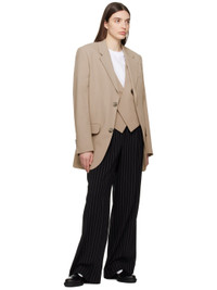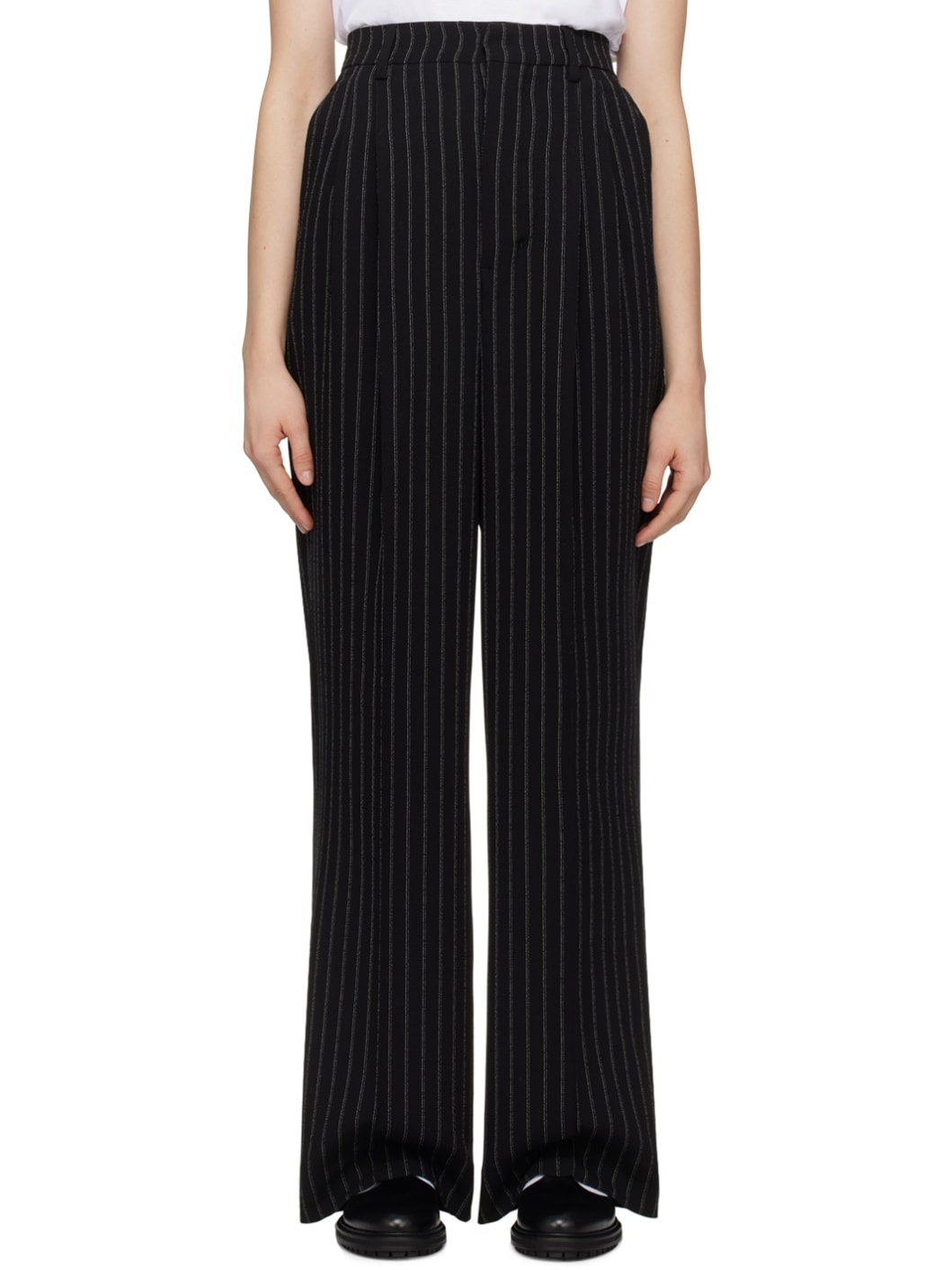 Wide-fit virgin wool crepe trousers. Jacquard stripe pattern throughout. · High-rise · Belt loops · Four-pocket styling · Button-fly · Knife pleats at front · Partial satin lining Supplier color: Black/Chalk Body: 100% virgin wool. Lining 1: 100% polyester. Lining 2: 65% polyester, 35% cotton. Made in Romania 241482F087008