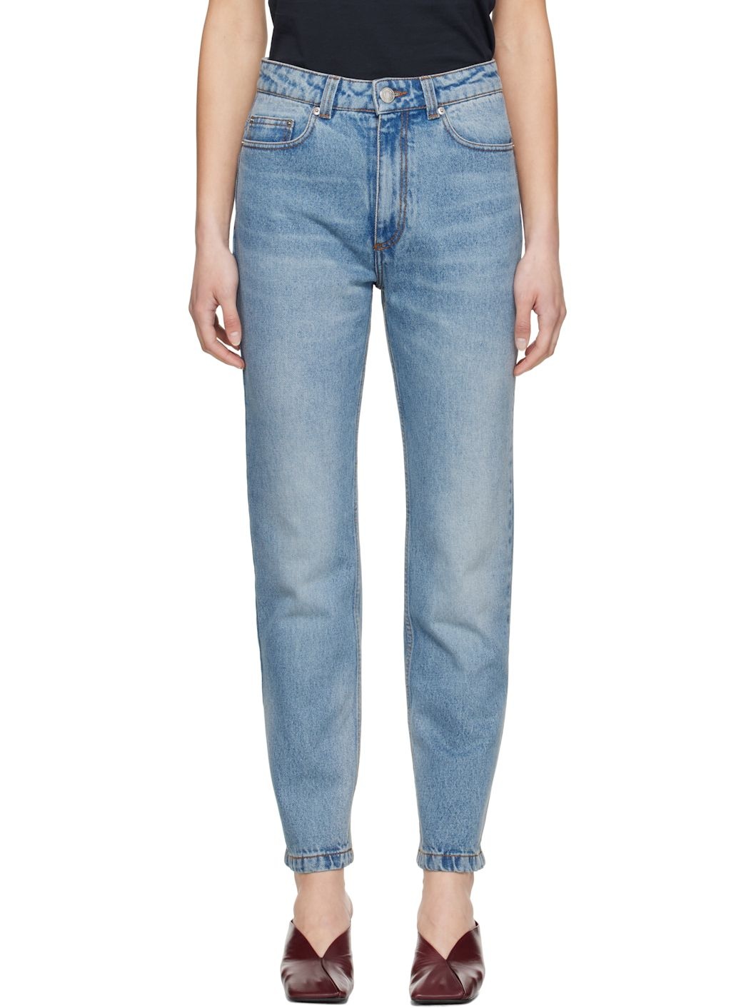 Non-stretch denim jeans. Fading and whiskering throughout. · Belt loops · Five-pocket styling · Button fly · Jacron logo patch at back waist · Logo-engraved silver-tone hardware · Contrast stitching in tan Supplier color: Used blue 100% cotton. Made in Portugal 251482F069005